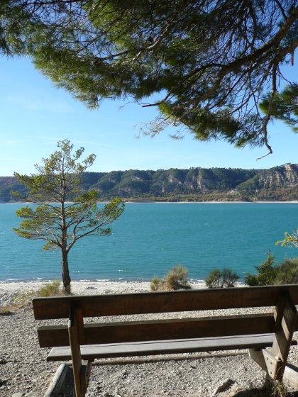 C’est la plus grande réserve d’eau potable d’Europe, la deuxième plus grande retenue artificielle de France avec une superficie de 2 200 ha. Construit en 1974 c’est le troisième barrage sur un total de cinq installés sur la rivière Verdon. A l’origine, les flots devaient engloutir les trois villages du bord du lac : Bauduen, Sainte Croix et les Salles sur Verdon. Au final, la côte a été rabaissée pour ne recouvrir que le village des Salles sur Verdon et avec lui la résurgence vauclusienne de Fontaine l’Evêque, des grottes du paléolithique plus bas dans la vallée ainsi que le pont de Garuby et le pont dit « romain » d’Aiguines à 9 arches, où fut tournée la scène de l’attaque d’aviation dans le film « Jeux interdits ». Il reste de ses événements une splendide étendue d’eau pure couleur turquoise dans un écrin de verdure, au cœur d’une région préservée et encore authentique.